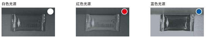 光源颜色对视觉检测效果有什么影响呢?来看一个例子,将红色的糖果包装纸放入棕色纸盒中,图中显示了使用白色、红色和蓝色光源时各自的对比度水平。