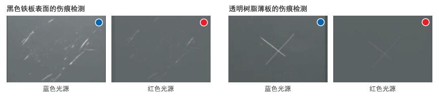 第2组图是蓝色光源和红色光源分别对黑色铁板和透明树脂薄板的伤痕检测。