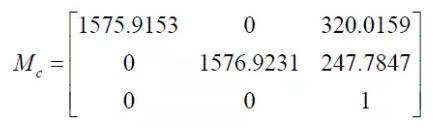 其中:(u,v)是特征点的图像坐标,(u0,v0) 光轴中心的图像坐标,(kx ky )是X 轴,Y 轴方向的放大系数,(xc yc zc) 是特征点在摄像机坐标系下坐标, Mc 是摄像机内参数矩阵。