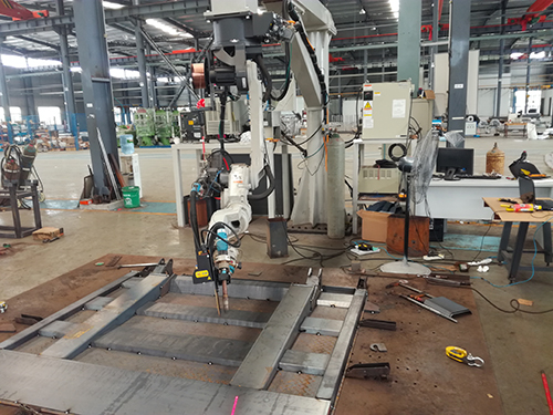 1.由于工件制造工序存在开料误差、折弯应力回弹、人工拼装误差等导致的焊缝位置一致性比较差,无法实现焊接专用设备、焊接机器人来固定位置焊接,无法实现自动化焊接。