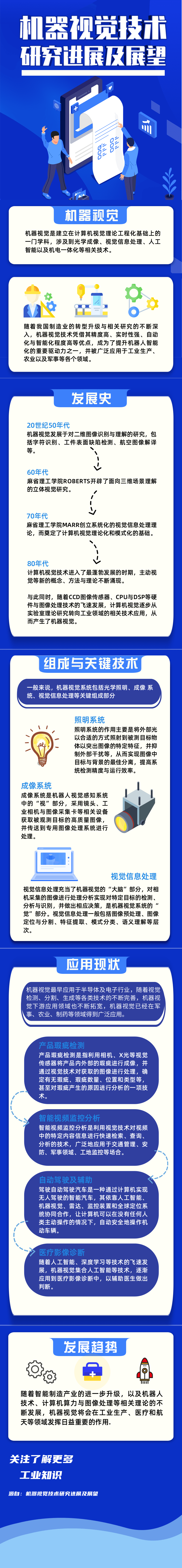 机器视觉是建立在计算机视觉理论工程化基础上的一门学科,涉及到光学成像、视觉信息处理、人工智能以及机电一体化等相关技术。随着我国制造业的转型升级与相关研究的不断深入,机器视觉技术凭借其精度高、实时性强、自动化与智能化程度高等优点,成为了提升机器人智能化的重要驱动力之一,并被广泛应用于工业生产、农业以及军事等各个领域。